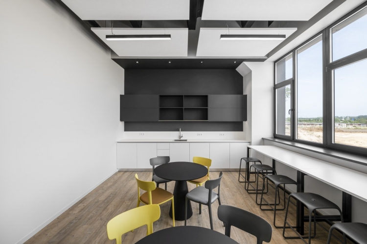 Naudota: juodas veidrodis, pilko atspalvio berėmio stiklo pertvaros, lubų akustiniai paneliai, veltinio akustinės lamelės, vinilinė grindų danga, akmens masės plytelės.